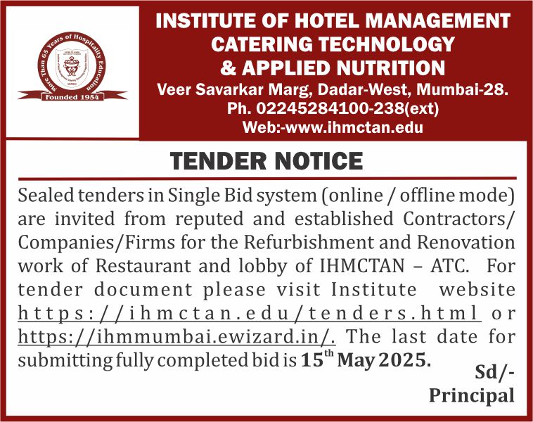 TENDER NO.: IHM/Tender/Hosteltoilets/Mumbai/2024-25